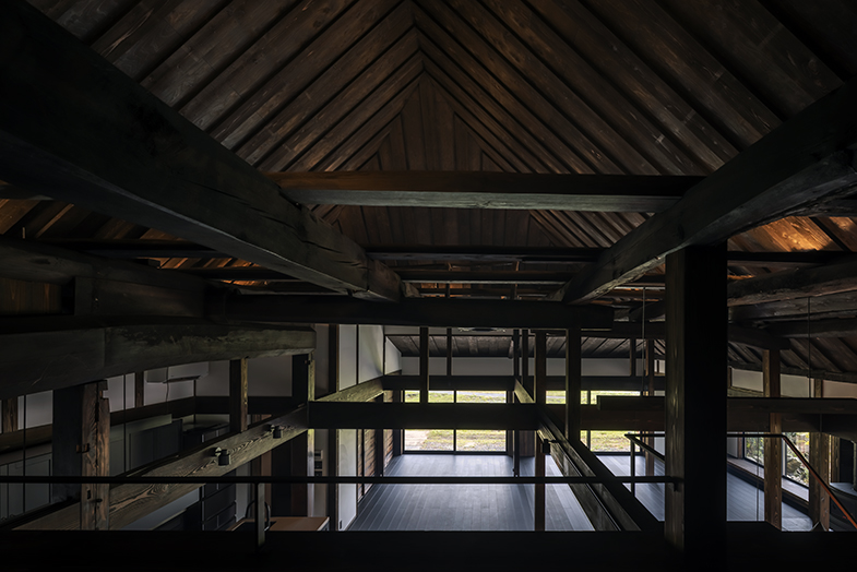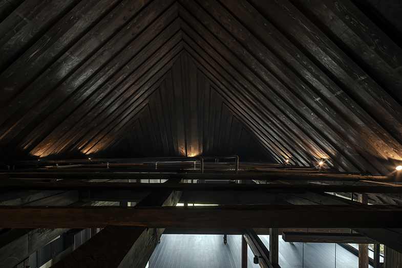 梁組より上は、既存の茅葺屋根を覆う形で「大和張り」の新しい天井を作りました。